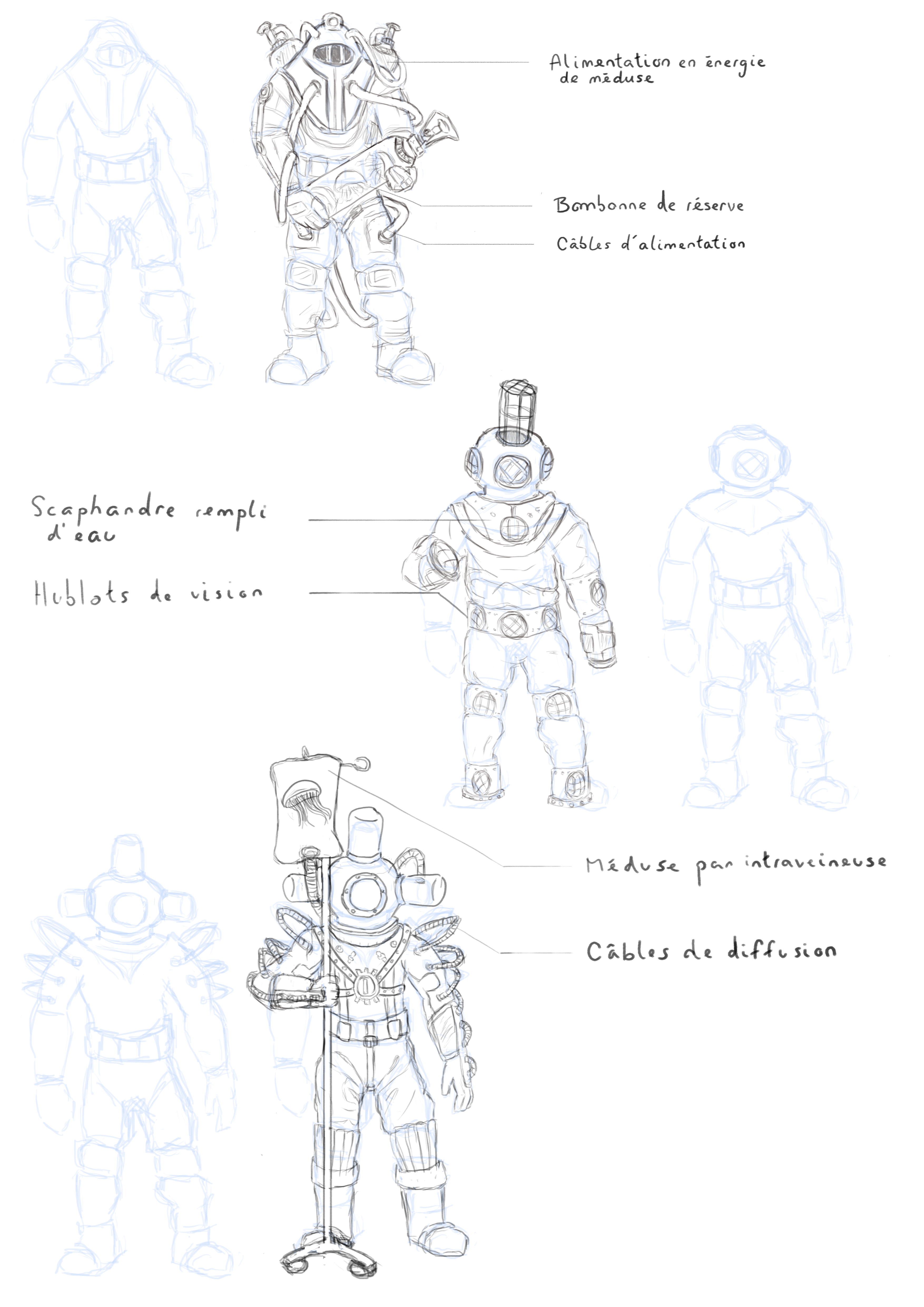 Pour cet exercice, nous devions imaginer un sujet sorti de l’univers Steampunk. Lors de mes recherches, j’ai décidé d’opter pour un personnage dans un scaphandrier.
